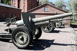 A modernized 152 mm fortress howitzer M1909/30 at the Hämeenlinna Artillery Museum.