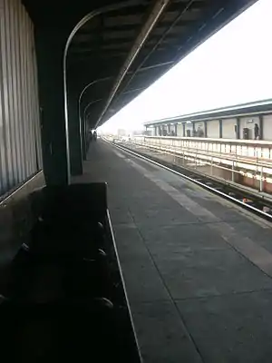 This elevated station has two tracks and two side platforms, with space for a center express track that was never added.[14][15] The station has beige windscreens and green canopies. This is the easternmost station on the Jamaica Line, east of here, trains go underground to the BMT Archer Avenue Line.