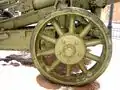 In contrast with World War I-era guns, the M1931 had a split trail carriage, allowing for much wider traverse angle. The carriage was fitted with a leaf spring suspension and ten-spoke metal wheels with solid rubber tires. Some late production pieces had ML-20-type wheels with pneumatic tires. The carriage also featured spring-type equilibrator. The Gun shield gave the crew some protection from small arms and shell fragments.