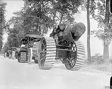 135th Siege Bty went out to Western Front in the summer of 1916, the advance party leaving on 11 August, and on 13 August the guns and the motor transport column of the Army Service Corps (ASC) – four caterpillar tractors, over 30 lorries, plus a car and assorted motorcycles – went to Avonmouth Docks to be shipped to France. The rest of the personnel embarked on the Golden Eagle at Folkestone Harbour on 19 August. After unloading the guns at Boulogne the battery entrained and joined the advance party at La Houssoye on 23 August, where it joined III Corps' Heavy Artillery on 23 August.[9][10]