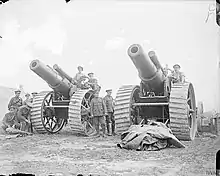 The battery left Cullercoats on 4 June to join R Siege Brigade (Training) at Horsham and after a month moved to Lydd to complete its training, first with B Bde, then with C Bde. On 29 July the battery began to move to Bristol to mobilise, where its guns were waiting. The battery was equipped with four 8-inch howitzers.[5][6] At this stage of the war the 8-inch howitzers in use (Marks I–V) were improvised from cut-down and bored-out barrels of 6-inch coast defence guns, with the recoil checked by enormous wooden wedges.[7][8]