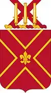 The red of the shield signifies Artillery. The outline in gold of the saltire or diagonal cross denotes that the Regiment was organized in the south; viz; The Coast Defenses of Charleston, Pensacola, Key West and Galveston. The saltire is taken from the battle flag of the Confederacy and, as only its outline appears on the shield, denotes a suggestion of the south. The fleur-de-lis stands for the service in France of the 121st Company, C.A.C. (Battery C, 61st Artillery, C.A.C.)