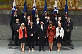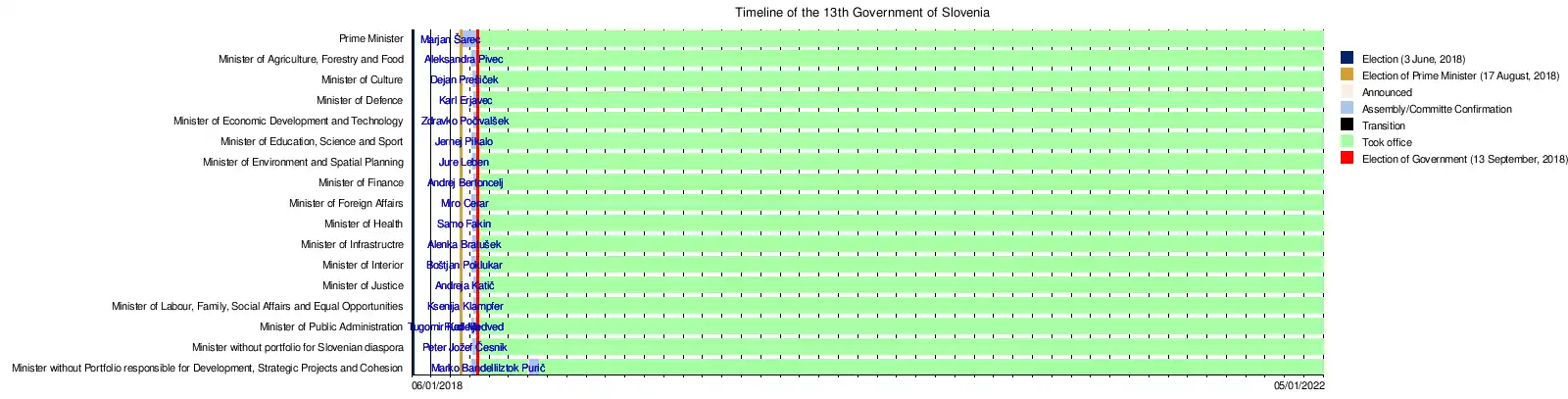 The 13th Government of Slovenia was elected on 13 September 2018 by the 8th National Assembly. It is the first minority government in the history of Slovenia. On 27 January 2020, following the resignation of the Minister of Finance Andrej Bertoncelj, Prime Minister Marjan Šarec announced his resignation. The National Assembly was informed on the same day following which the term of the 13th Government ended.[1] Šarec is the third consecutive and in total fourth Prime Minister to resign, before him Miro Cerar, Alenka Bratušek and Janez Drnovšek resigned as well, the latter due to being elected President of the Republic. The 13th Government is the fifth consecutive and eighth government in total to not finish its term.