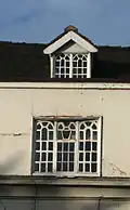 140–142 Hospital Street is one of a group of houses dating from the 15th and 16th centuries at the end of Hospital Street, which include Churche's Mansion, number 116 and The Rookery (number 125).[8] It is a timber-framed building with a predominantly rendered finish under a tiled roof.[1][18] It has three bays to the main front face and two storeys with attics. An 18th-century extension on the east (left) side is in painted brick and faces onto a passageway; the rear of the building also dates from the 18th century.[1][8] The upper storey overhangs to form a continuous jetty along the front façade.[1][8] A common urban design, this was an unusual layout for a Nantwich mansion; other examples had a central hall with flanking wings as, for example, at Churche's Mansion, a few houses up the street.[8] The Hospital Street face was originally close studded, that is, decorated with closely spaced upright timbers, as at the Crown Hotel on the High Street. The timbering was covered in the late 17th century, giving the building its current 17th-century appearance.[8]