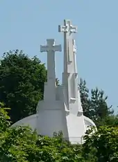 Bishop Jerzy Tyszkiewicz started an official canonization case in 1649 and ordered a search of the remains of the martyrs. The results of the search are not known. It is likely that canonization efforts were abandoned due to the Russo-Polish War (1654–67) and Tyszkiewicz's death in 1656.[3] Three wooden crosses were built on the Bleak Hill (now in Kalnai Park) where the martyrs were reportedly beheaded.[1] The exact date of the construction is unknown, but it was possibly related to the efforts of canonization. The first undoubted representation is from a 1648 panegyric to Bishop Tyszkiewicz.[3] According to Jan Nepomucen Fijałek, the Three Crosses were also depicted on two silver portraits of St. Casimir that were made in 1636 and were present in Vilnius Cathedral until the first half of the 20th century.[3] Wooden crosses would rot and needed to be periodically replaced. Concrete monuments were erected in 1916 (architect Antoni Wiwulski; torn down in 1950) and 1989 (architect Henrikas Šilgalis).[4]