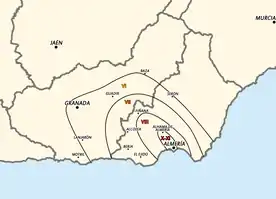 The 1522 Almería earthquake (Spanish: Terremoto de Almería de 1522) was a major seismic event estimated to be 6.8–7.0 Mw that occurred on September 22. The epicenter was in the capital of Almeria in the Andarax Valley, near Alhama de Almería. It had a maximum felt intensity of X–XI (Extreme), and killed about 2,500 people, making it the most destructive earthquake in Spanish history.