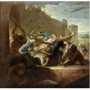 The historian G. de Felice charges that corrupt clergy members had instructed their listeners that the Catholic Church's teaching of juramentum contra utilitatem ecclesiasticam prœstitum non tenet ("No oath contrary to ecclesiastical utility [the interests of the Church] is binding"), meant that any promise to someone deemed a heretic did not have to be upheld.[23] In any event, the promise of safety was not upheld – those who had abandoned their weapons and left the Hôtel de Ville were soon met by an angry Catholic mob.[23]