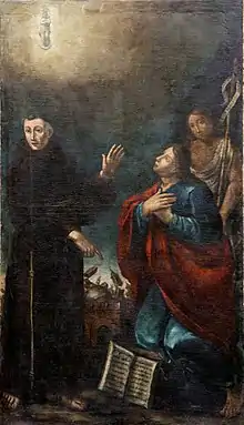 Giovanni Battista Tinti, St. Francis Solanus shows 1570 earthquake to St. John the Apostle and St. John the Baptist (Municipal pinacotheca of Cento)