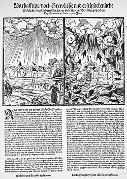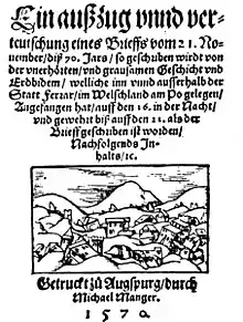 Announcement in a 1570 German woodcut broadside of Ferrara earthquake and Florence burning