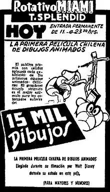 "15 mil dibujos" (15 thousand drawings) is a 1942 Chilean animated film of 35 millimeters made by the filmmakers Juan Carlos Trupp and Jaime Escudero Sanhueza.[1] It filmed by Enrique Soto and musicalized by The Chilean band Los Huasos Quincheros.[2] "15 mil dibujos" is the third Chilean animated film[1] after other movies like: "Transmisión del mando presidencial" (1921) and "Vida y milagros de Don Fausto" (1924).[3] However, it was considered the first Chilean animated film by some media.[4]