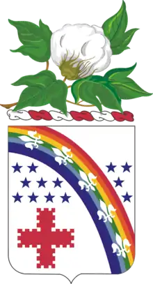 The 167th Infantry Regiment fought under the 42nd Division in World War I and fought in five major campaigns, symbolized in the 5 fleurs-de-lis on their coat of arms. The red cross embattled commemorates the carrying of entrenched Croix Rouge Farm below Fere-en-Tardenois in the Battle of Soissons on 26–27 July 1918.[2]