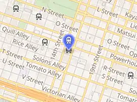 16th Street is a side platformed Sacramento RT Light Rail station in Downtown Sacramento, California, United States. The station was opened on September 5, 1987,[1] and is operated by the Sacramento Regional Transit District. Located at 16th Street between Q and R Streets (in an alley), it is served by the Gold and Blue Lines, and is the easternmost station where transfers can be made between both rail lines. With a daily average of 7,100 riders, the 16th Street station is the busiest in the RT light rail system.[2]