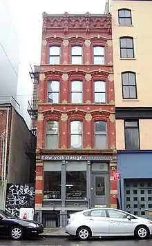 175 West Broadway is a building between Worth and Leonard Streets in the Tribeca neighborhood of Manhattan, New York City. Built in 1877, it was designed by Scott & Umbach, an architectural firm from Newark, New Jersey, in the polychromatic brick style. According to the New York City Landmarks Preservation Commission, the building's "corbeled window arches and the corbeled brick cornice are without parallel in New York City architecture."[1] It was built as a rental property for the heirs of Jerome B. King, a notable manufacturer of plaster and cement products, and was occupied for many years by Harwood & Son, who manufactured and sold awnings and other products made from canvas[2]