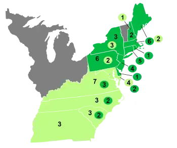 | Presidential election results map. Green denotes states won by Washington. Numbers indicate the number of electoral votes cast by each state.[note 1] | |