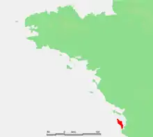 The municipalities where the greatest damage was reported (Bouin, Machecoul) are close to these fractures, as are the localities where the earthquake was felt with force even if the damage was less ( Champtoceaux, Beauvoir-sur-Mer, Saint-Gilles-Croix-de-Vie, Nantes, La Brière, Tiffauges, and, further on, La Flèche).[10] The epicenter was located on the continental shelf off the island of Noirmoutier, in Bourgneuf bay. The earthquake caused a large wave felt in Belle-Île-en-Mer, La Rochelle and in the Loire Valley.[10]