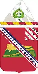Shield: Gules, a conventionalized castle of Ehrenbreitstein with ramp Or on mount Proper, debruised by a bendlet Argent bearing two ribbons of the field and Azure with seventeen mullets of the last. A sinister canton bendy of eight ermine and of the field, (for the 8th Field Artillery). Crest: On a wreath of the colors Or and Gules, a mount Argent garnished Vert, bearing a linden leaf Proper charged with a fleur-de-lis of the first. Motto: IN TIME OF PEACE PREPARE FOR WAR.