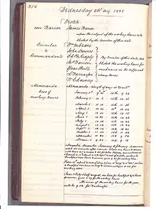 On September 29, 1806, Commodore Thomas Tingey reported to Secretary of the Navy Robert Smith his problems with "the Ship Carpenters, Smiths and Riggers". They were upset that their wages had been reduced. The ship "Joiners too, believed that they also were to remain at their former rate of pay. They therefore remonstrated but were informed it could not then be altered - A few days afterward (in the first week of August), they unanimously withdrew from work and deputized 3 or 4 of their numbers, who came to the yard presented a written paper to Captain Cassin, who offered it to me, I refused to receive or peruse it. ... It is undeniable that I consider them a steady and valuable set of workmen ... but I deem it inadmissible to advocate, raising their pay to 1.75 per diem."[20] The second on 13 March 1827, when a dispute over wages provoked laborers to leave the yard briefly to express their displeasure. The third began on 23 March 1830, when the laborers were recorded "standing out" for a week to show that their per diem wage rate should have been granted sooner.[21] These job actions represent a period when federal workers, though not unionized, could strike—an option later denied to government employees with the passage of the 1947 Taft–Hartley Act.[22] Except for the brief entries made by the commanding officer to the secretary of the Navy or the officer of the watch in the station log, little is known about the exact circumstances of these early incidents.