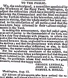 Josephine Seaton, a keen observer and the daughter of the publisher of the National Intelligencer, William Seaton, states the Navy Yard strikers played a significant role in the Snow riot: "Snow will certainly be torn to pieces by the mechanics if he be caught, and they are in full pursuit of him. Unfortunately, several hundred mechanics of the navy yard are out of employment, who, aided and abetted by their sympathizers, create the mob, — the first I have ever seen, not recollecting those of Sheffield, and it is truly alarming."[60] Seaton was one of the few whites to record the strike, a strike which revealed the corrosive effects of racism on the Navy Yard workforce as white workers sought to blame their precarious economic situation on free and enslaved African Americans. The riot was widely publicized in national and local newspapers and alarmed the white community. "The drunken rioters acted with impunity so long as they limited their attacks to Black people. When they began to menace the homes of wealthy whites... the city government called out the militia"[61] As their economic situation deteriorated and stung by public criticism of their actions, the Navy Yard mechanics and laborers sought to end the strike. The two sides came together in an agreement that both Hull and the workers accepted through the offices of an outside mediator, Dr. Alexander A. McWilliams, who had a medical practice adjacent to the Navy Yard and was known to both the workforce and Hull. As a result, the Department of the Navy encouraged mediation, and the Navy Yard labor strike ended on Saturday, 15 August 1835, when the mechanics returned to work.[62]