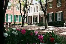 The gated courtyard gardens on the lower level create a promenade between the Fava Building and the Carroll Mansion. Designed to give a hint of the past, they include boxwood, flowers of the Carroll period, and a herb garden. Underneath the brick, where Charles Carroll of Carrollton's stable was sited, is a hypocaust. This, perhaps, was used to keep the water warm for the horses in the cold winters. The upper courtyard with its tall flowering trees and boxwood is enclosed by the 1840s Carrollton Inn.