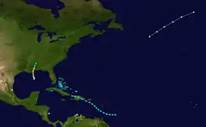 The 1855 Atlantic hurricane season featured tropical cyclone landfalls in the Gulf Coast of the United States, the Greater Antilles, and Mexico, but none along the East Coast of the United States. It was inactive, with only five known tropical cyclones. Operationally, another tropical storm was believed to have existed offshore Atlantic Canada in late August and early September,[1] but HURDAT – the official Atlantic hurricane database – now excludes this system.[2] The first system, Hurricane One, was initially observed on August 6. The final storm, Hurricane Five, was last observed on September 17. These dates fall within the period with the most tropical cyclone activity in the Atlantic. At one point during the season, two tropical cyclones existed simultaneously. Two of the cyclones only have a single known point in their tracks due to a sparsity of data, so storm summaries for those systems are unavailable.