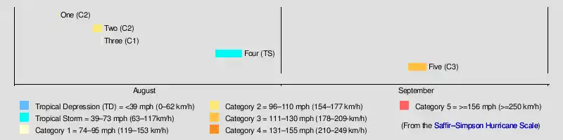Of the season's five tropical cyclones, four reached hurricane status. Furthermore, one of those four strengthened into a major hurricane, which are Category 3 or higher on the modern-day Saffir–Simpson hurricane wind scale. The strongest cyclone of the season, Hurricane Five, peaked at Category 3 strength with 125 mph (200 km/h) winds. It brought only minor impact to Louisiana and Mississippi. The first storm of the season brought locally severe impact to Tampico, Tamaulipas, Mexico in early August. Tropical Storm Four caused severe damage in the Lesser Antilles.