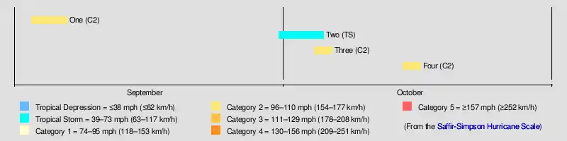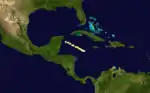 As the previous storm was moving along the coastline of the southeastern United States, a new hurricane was observed in the western Caribbean Sea, about halfway between Honduras and Jamaica. Its intensity, based on a ship report, was estimated at 105 mph (165 km/h). The hurricane moved slowly west-northwestward, and another ship experienced its strong winds on October 7. There were no further observations, so its complete track is unknown.[1][2]