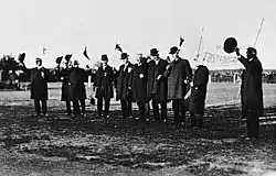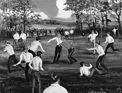 William J. Leggett, later a distinguished clergyman of the Dutch Reformed Church, was the Rutgers captain; William Gummere, who later became chief justice of the Supreme Court of New Jersey, captained the New Jersey squad.[8] The game was played in front of approximately 100 spectators.[9] The players from Rutgers wore scarlet-colored turbans and handkerchiefs to distinguish themselves from the Princeton players. The scarlet of the Rutgers Scarlet Knights came from this episode.[10]