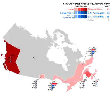 | Liberal | none (unofficially, Edward Blake) | 111 | 62 | 94 | +53.2% | 110,556 | 34.72% | +12.05pp | |