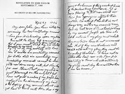 In 1911, John W. Taylor, Taylor's son and an apostle claimed that he had discovered the revelation among his father's papers after his death in 1887. Unfortunately, his was a copy written in his own hand.[3] Photographs of the original document exist,[4] but the document itself is not extant.[3] Examinations of the photographs have suggested that the document is in John Taylor's handwriting.[3] In 1912, Lorin C. Woolley, a Mormon fundamentalist leader, published a claim that five copies of the revelation had been made and entrusted to LDS Church apostle George Q. Cannon (and four other men who were not LDS Church officials) with the intent of preserving it for posterity.[3]