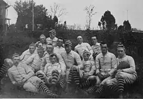 The first college football game was played on November 6, 1869, between Rutgers and the College of New Jersey.[2] Although the sport continued to grow, it was not introduced for another 23 years at VAMC. In September 1891, VAMC President John McBryde approved an athletic association for the college. Later that fall, a group of students gathered in a field behind the Number One Barracks (now Lane Hall)[3] to play the first pick-up games of football.[1] In September 1892, with the help of Biology Professor Ellison Adger Smyth (known as the father of modern football at Virginia Tech),[1] Physics Professor William E. Anderson, and cadets H. B. Pratt and John Walter Stull, a call went out for cadet players and two teams were formed, which would become Virginia Tech's first football squad.[1][3] Smyth served as coach of the team and Anderson was chosen as captain.[1] They had to go to the barracks every day and ask cadets to participate, since most of the players who were assigned to the second team felt that they had been insulted and refused to return to practice on the following day.[1][3]