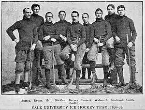 Yale University hockey team in 1896–97. From left: Herbert Sutton, Henry Ryder, John Hall, George Sheldon, Amos Barnes, William Barnett, Clarence Walworth, Sanford Stoddard, Robert Smith.