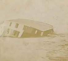 The worst effects were observed along the Northeastern shoreline from New Jersey to New England. In these areas, coastal flooding and persistent gales inflicted an estimated $500,000 in damage to beachfront property. Many small houses, seawalls, wharves, and piers were damaged or destroyed.[5][11] Wind gusts along the Jersey Shore reached 75 mph (120 km/h), which unroofed buildings and blew summer cottages off their foundations.[13] Homes and businesses in Asbury Park were bombarded by the debris from a half-mile stretch of boardwalk that was torn apart.[11] Thousands of spectators lined the shoreline there to watch the enormous waves.[13] One of the premier hotels in Sea Isle City was demolished,[11] along with numerous cottages.[13] The storm heavily flooded streets in the city and damaged yachts along the coast.[6] Just south of Sea Isle City, the steamer Spartan went ashore after her captain spent 30 hours fighting the storm at the wheel.[12] In Atlantic City, one amusement pier was heavily damaged by an impact from the dislodged wreckage of a previously sunk schooner,[14] while another was broken up by the surf.[11] Winds in Atlantic City gusted to 55 mph (90 km/h), and floodwaters surrounded some cottages, forcing residents to leave their homes by boat. The railway to Ocean City was washed out, leaving the community temporarily isolated. Railroad tracks were also submerged to the south at Cape May.[6] Farther inland, the winds brought down some few trees and overhead wires.[15] In Millville, high tides caused the Maurice River to overflow and destroy crops in bordering fields.[16]