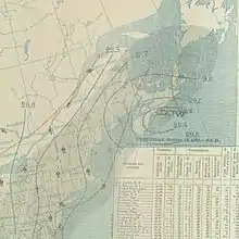 ![]() Surface weather analysis of the hurricane off the Mid-Atlantic coast on October 11, 1896 | |