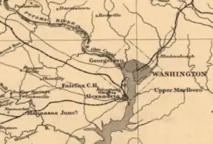 In early December 1862 the regiment moved by rail to the Bladensburg, Maryland area, close to Washington, D.C.[6] They received training at this location, and were armed with a saber and Merrill carbine. Cavalry soldiers considered this carbine inferior and "comparatively worthless".[6] Timothy M. Bryan Jr. was appointed colonel and commander of the regiment effective December 24, but did not assume command until May 1863. A West Point graduate, he had been an officer in the regular U.S. Army, and had previously been a lieutenant colonel with the 12th Massachusetts Infantry Regiment.[6][7] Without Bryan, the regiment had its first mounted drill on December 25. Beginning January 1863, the regiment was attached to Colonel Percy Wyndham's Cavalry Brigade for the defense of Washington.[8] The 5th New York Cavalry and 1st Vermont Cavalry Regiments were also part of Wyndam's brigade.[9] Camp for the 18th Pennsylvania Cavalry was moved to Virginia on January 1, 1863, and settled a week later on the Little River Turnpike about 2 miles (3.2 km) from Fairfax Courthouse.[5][Note 3]