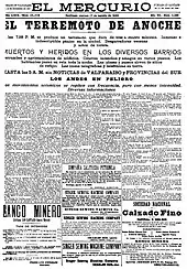 The earthquake was also felt in Santiago, the capital of Chile. The newspaper El Mercurio reported in its August 17 edition that "the earthquake was produced in a violent way since its beginning, and provoked an indescribable panic through all the four thousands of inhabitants of Santiago and an unprecedented terror in the last years. Two or three-story buildings, even the most solid ones such as the National Congress, were swinging like a vessel in the sea. The shakings were so strong that many people thought the earth was going to open itself in deep and long strips."[14]