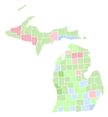 | Mackinac | 612 | 34.63% | 730 | 41.31% | 395 | 22.35% | 0 | 0.00% | 28 | 1.58% | 2 | 0.11% | -118[lower-alpha 3] | -6.68% | 1,767 |
