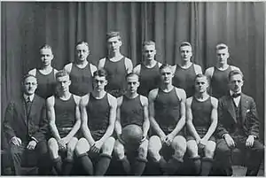 The 1915–16 season was a follow up to an undefeated season, in which the Fighting Illini men's basketball team won both a national and Big Ten Conference championship. Coached by Ralph Jones, the Illini continued their winning ways by finishing the season with an overall record of 13 wins and 3 losses and a 9 win 3 loss conference mark. Taking second in the Western Conference to the National Champion Wisconsin Badgers men's basketball team. During the season, the Illini dropped two games to Northwestern and one to eventual champion Wisconsin, but the first loss to the Wildcats was the Illini’s first-ever overtime game as Northwestern scored two points in the overtime period to beat Illinois, 23-21, February 12, 1916, at what is now the Kenney Gym Annex. The starting lineup included Gordon Otto, Dan W. Elwell and Ralf Woods rotating at the forward position, center C. G. Alwood, and guards Clarence Applegran and captain Ray Woods.[2] Woods was named an All-American for his work during this season.[3] Woods and Alwood were named All-Big Ten players for the season.