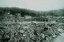 Over 10 in (250 mm) of rain fell throughout the upper French Broad River watershed, with much of that rain falling within 24 hours. The river rapidly rose to an estimated crest of 23.1 ft (7.0 m), accompanied by a flow rate nearly seven times the average annual peak. The nearby Swannanoa River reached a crest of 20.7 ft (6.3 m) with a flow rate over six times the average annual peak.[28] The Asheville area, crossed by the French Broad and Swannanoa rivers, was heavily impacted by flooding.[28] The French Broad River near Asheville had remained at high levels throughout the week preceding the hurricane-fueled rains. Asheville itself was located outside of the heaviest rainfall but was subject to river flooding induced by the upstream rainfall. The first news reports of the city's impending flood came on the afternoon of July 15, when the headwaters of the Swannanoa River rose to flood stage. The flooding reached Asheville by the morning of July 16, destroying buildings, disrupting electric and gas distribution, and placing much of the city underwater.[34] The French Broad River rose rapidly after July 16, and at Asheville the estimated crest was 21 ft (6.4 m). While the banks of the river were ordinarily 381 ft (116 m) across at Asheville (associated with a 4.4 ft (1.3 m) flood stage, the floods bloated the river to about 1,300 ft (400 m) across.[31] The rise of the French Broad River razed hundreds of homes and destroyed other adjacent establishments.[28] In some cases, the floodwaters reached the second stories of buildings. All riverside industrial plants took on major flooding.[31] Riverside Park—once a popular amusement park along the river's banks—was destroyed. All three bridges crossing the river in Asheville were also destroyed. At the entrance of the Biltmore Estate, floodwaters stood 9 ft (2.7 m) deep. Floods upstream of the city destroyed dams, wiping out Asheville's hydropower supply.[28] The dam failures also precipitated the flash flood event that impacted the city.[35]