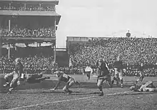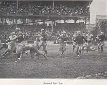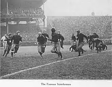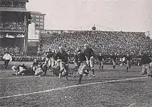 The lone scare of the 1916 season occurred at Navy when, following a delay of the team's train heading to Annapolis that caused a late arrival, the team overcame several fumbles and eked out a 20–19 victory.[2] The 1916 team was led by center Bob Peck, Pitt's first first-team All-American, and All-American end James Pat Herron, as well as All-Americans fullback Andy Hastings and guard "Tiny" Thornhill. Also on that team were Jock Sutherland and H.C. "Doc" Carlson who would go on to become perhaps Pitt's most legendary coaches in football and basketball, respectively. This Pitt Panthers football team was given the nickname "the greatest eleven in the world."[3]
