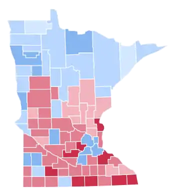 Wilson's performance was the closest any Democrat had come to carrying Republican stronghold Minnesota since Minnesota's statehood inception in 1858[1] – he was almost five percent ahead of his losing margin in 1912 when the state was won by Progressive Theodore Roosevelt. Wilson comfortably won the urban counties of Ramsey, Hennepin and St. Louis, which became rigid strongholds for the Democratic Party. Wilson also led Hughes in the socialist strongholds of the forestry- and mining-dominated northern counties. Nevertheless, Hughes won the state with dominance of the farming districts in the south and his ability to carry fifty-three of eighty-seven state counties. Wilson was however the first Democrat to ever carry Lake, Kandiyohi, Saint Louis, Norman, Todd, Lyon, Murray and Martin Counties,[2] the first to carry Carlton County since Winfield S. Hancock in 1880, and the first to win Hubbard County since Grover Cleveland in 1888.[2]