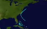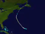 A tropical storm was first detected about 570 mi (920 km) northeast of the northern Leeward Islands on September 2.[4] The cyclone moved west-northwestward and reached hurricane status early on September 3, based on a ship observation of 81 mph (130 km/h) winds.[3] Later that day, the storm curved northwestward. Intensifying further, the system became a Category 2 hurricane late on September 4.[4] While passing west of Bermuda early the following day, winds of at least 60 mph (100 km/h) bring down trees and shatter windows, while many boats were swamped or blown aground.[8][9] Early on September 5, the hurricane peaked with maximum sustained winds of 110 mph (175 km/h) and a minimum barometric pressure 972 mbar (28.7 inHg).[3]