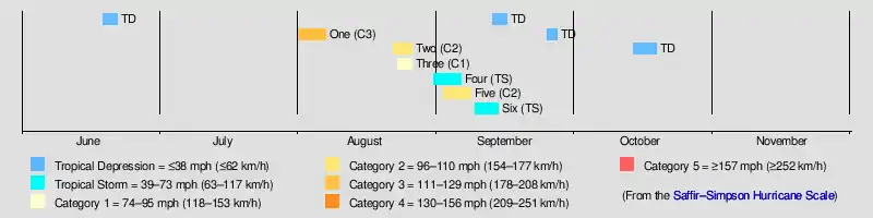 The 1918 Atlantic hurricane season featured two hurricane landfalls in the United States. The season was inactive, with a total of six tropical storms developing, four of which intensified into hurricanes. One of the four hurricanes became a major hurricane, which is Category 3 or higher on the modern-day Saffir–Simpson scale.[1] Additionally, there were four suspected tropical depressions, including one that began the season on June 19 and one that ended the season when it dissipated on October 19. The early 20th century lacked modern forecasting and documentation, and thus, the hurricane database from these years may be incomplete. Four previously unknown tropical cyclones were identified using records, including historical weather maps and ship reports, while information on the known storms was amended.