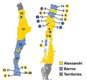 ![]() Presidential election results map. Yellow denotes states won by Alessandri and blue denotes states won by Barros. Numbers indicate the number of electoral votes cast by each province. | |||||||||||||||||||||||||