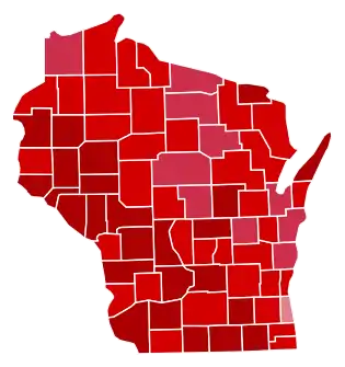 A poll by the giant Rexall drug store chain – which in 1916 had been accurate enough to predict Wilson's razor-thin wins in New Hampshire and California[13] – suggested Harding would win 382 electoral votes,[14] and at the end of October, although no more opinion polls had been published, most observers were even more convinced that the Republicans would take complete control of all branches of government.[15] Polls were similarly confident in Wisconsin, despite forecasts of a big vote for imprisoned fifth-time Socialist nominee Eugene V. Debs.[16] Expectations of a landslide were fully realised: whereas Charles Evans Hughes had carried Wisconsin by only 6.59 points in 1916, Harding won this arch-isolationist state by a nine-to-two majority. Wisconsin would prove to be Harding's fourth strongest state in the 1920 election terms of popular vote percentage after North Dakota, Vermont and Michigan.[17] Wisconsin would prove Cox's weakest state in the largest landslide loss in United States presidential election history, and Debs’ strongest state in his last campaign for the presidency.[17] Despite Debs’ substantial vote, Harding carried all Wisconsin's counties with absolute majorities, becoming the only candidate to ever win every single Wisconsin county in a presidential election, and Cox cracked twenty-three percent of the vote in just three counties. This is the last time a Republican ever swept all Wisconsin counties in a statewide election.