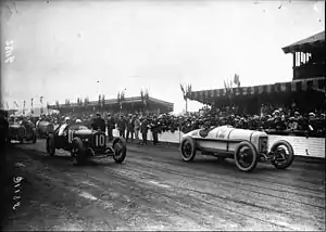 Émile Mathis was the sole other French entrant with a car of his own manufacture. Still so close to war's end, German teams were not invited.[15] The Anglo-French STD (Sunbeam) company had seven cars entered, however ten days out from the race Louis Coatalen, racing director realised the cars would not be prepared and withdrew the team. When the drivers protested he relented to let anyone who could be ready to race. In the event four started – those for René Thomas, André Boillot and Brooklands regulars Kenelm Lee Guinness and Henry Segrave - while another STD entrant, alcohol heir André Dubonnet, switched to Duesenberg to replace their injured driver, Inghilbert.[20][21] FIAT had entered three of its new 802 models,[22] including cars for Bordino, and Sivocci (formerly at Alfa Romeo). However industrial unrest in Italy prevented them being ready and delivered in time.[20][16] When entries closed the list was quite short. Fred Duesenberg had been keen to send four cars across but could not afford the shipping costs. When French-American spark-plug manufacturer Albert Champion provided $60000 of sponsorship, their entries were gladly received.[20][12] The works drivers of Murphy, Guyot and Boyer were supplemented by French driver Louis Inghilbert.