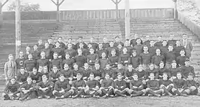 The 1921 Washington & Jefferson Presidents football team represented the Washington & Jefferson College during the 1921 college football season. Coached by Greasy Neale, went 10–0 in the regular season, defeating Pitt, University of Detroit, and Syracuse.[1] The 7–0 victory over rival Pitt was celebrated with a day of canceled classes and a bonfire with inspirational speeches in front of the Washington County Courthouse.[1] As the best team from the east, W&J was invited to the 1922 Rose Bowl to play the best team from the west: the undefeated and heavily favored California Golden Bears.[1] Some had even begun to call Cal the best team in college football history.[2] The Red and Black sent 20 men on the cross-country trip and Robert M. Murphy mortgaged his home to pay his six family members’ way.[1] W&J would be the last Rose Bowl team to play the same 11 men the entire game. During the train ride to Pasadena, in which Greasy Neale continued to prepare his men, Lee Spillers caught pneumonia and could not finish the journey.[1] Ross "Bucky" Buchannan, a reserve player who had stowed away on the train and was fed smuggled sandwiches during the trip, was available to fill Spillers' roster spot.[1][2]