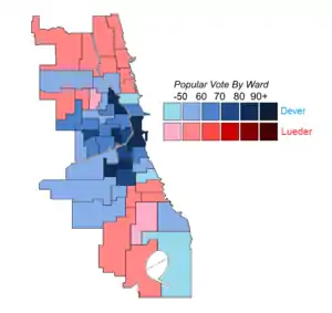 Dever won thirty-two of the city's fifty wards[2] (the 1923 election was the first after the city had redistricted itself from 35 to 50 wards).[3] His greatest share of votes was in the city's ten inner-city ethnic wards, located in traditional Democratic strongholds.[2] Lueder won the wards in traditionally-Republican areas on the edge of the city.[2] However, Dever made inroads with voters in these edge wards.[2] Dever also had made inroads among Black and Jewish voters.[2][3]