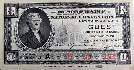 The Ku Klux Klan had surged in popularity after World War I, due to its leadership's connections to passage of the successful Prohibition Amendment to the U.S. Constitution.[3] This made the Klan a political power throughout many regions of the United States, and it reached the apex of its power in the mid-1920s, when it exerted deep cultural and political influence on both Republicans and Democrats.[4] Its supporters had successfully quashed an anti-Klan resolution before it ever went to a floor vote at the 1924 Republican National Convention earlier in June, and proponents expected to exert the same influence at the Democratic convention. Instead, tension between pro- and anti-Klan delegates produced an intense and sometimes violent showdown between convention attendees from the states of Colorado and Missouri.[4][5] Klan delegates opposed the nomination of New York Governor Al Smith because Smith was a Roman Catholic and an opponent of Prohibition, and most supported William Gibbs McAdoo. Non-Klan delegates, led by Sen. Oscar Underwood of Alabama, attempted to add condemnation of the organization for its violence to the Democratic Party's platform. The measure was narrowly defeated, and the anti-KKK plank was not included in the platform.[4]