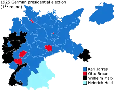 Seventeen candidates stood in the first round. Hindenburg was not included among them as he would not be nominated as a candidate until the second round. Instead, the most popular candidate of the political right was Karl Jarres of the German People's Party (DVP), a former Minister of the Interior, Vice-Chancellor of Germany and mayor of Duisburg. Otto Braun, the SPD's candidate, was a former Minister-President of Prussia and a well known and respected figure. Zentrum's candidate, Wilhelm Marx, was the chair of the party and a former chancellor.