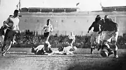The following game was the first test v. Argentina, played on 31 July at Gimnasia y Esgrima stadium. It was the first time Argentina wore the horizontal light blue and white jersey (after wearing blue and white jerseys alternatively since its first match in 1910) after a proposal by Gimnasia y Esgrima executive Abelardo Gutiérrez.[5] The match was attended by a record 12,000 spectators. After the match, MacMyn wrote: "The crowd was delighted. They were impressed by the fact that we played in silence, listening only to the captain's voice. Argentines have all the physical qualities required for rugby. They are big, strong and fast. They are tremendously enthusiastic –sometimes, excessively".[4]